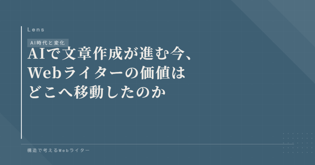 AIで文章が書けるようになったことで、「Webライターの価値はどうなるのか」という問いを目にする機会が増えました。作業は減るのか、将来性はあるのか、代替されるのか。議論はさまざまですが、その多くは「仕事が残るかどうか」という二択に寄りがち。 ...