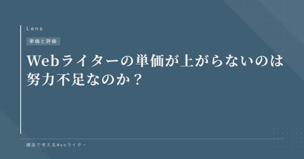 Webライターとして活動していると、「単価が上がらない」と感じる時期があります。納期を守り、修正にも対応し、勉強もしている。それでも文字単価が変わらない。 そうなると、「努力が足りないのか?」と考えてしまいがちです。ただ、単価は努力だけで決...
